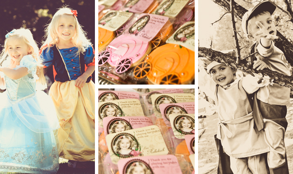 Party guests went home with large iced biscuits in the shape of Cinderella's coach and sealed with a matching "Once Upon A Time" personalised goodie bag sticker. But again, the list of possible party favors with this theme is endless: crowns for the girls, swords for the boys, edible mice (like the ones in Cinderella), little gingerbread houses, a fairy Godmother's wand.....