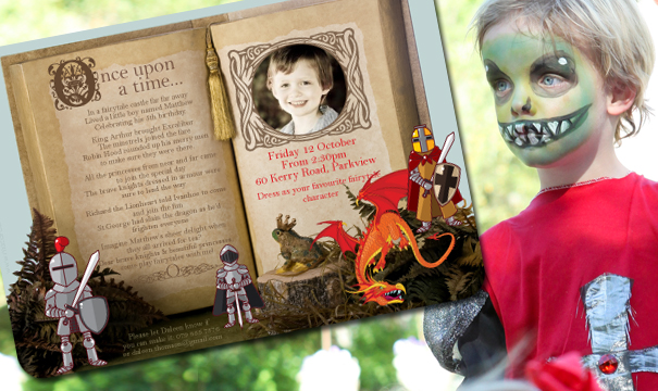 The theme works just as well for a boy's birthday celebration and our boys version of the "Once Upon A Time" invitation refers to dragons, King Arthur and the Knights of the round table...