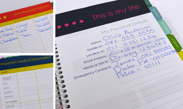 So, starting upfront, once you have picked your cover and open your diary: first off we have a "Plan" section with our "This Is Your Life" detail page - allowing you to fill in and list your personal information and emergency contacts. The planning section also includes other bright and useful pages such as a detailed page for filling in important medical information; a page to list the items that you have borrowed and lent - so that you don't forget; and a page to list your gift wish ideas that you pick up throughout the year.