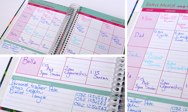 This year, we have tweaked the extra-mural activity planner so that you can fill it in for yourself and use it for your childrens' activities, if you have kids, or as a planner for your own exercise and hobby regimes. There are four double-page spreads, broken in to quarters of the year - so that you are able to change your plan based on seasons. It can also now be used by tweens and teens at School to plan their sports and homework schedules. Once filled in, it is a useful point of reference on what needs to be packed and prepared for each day. There is also a useful space to list the contact details of coaches, teachers and trainers at the bottom of each page.