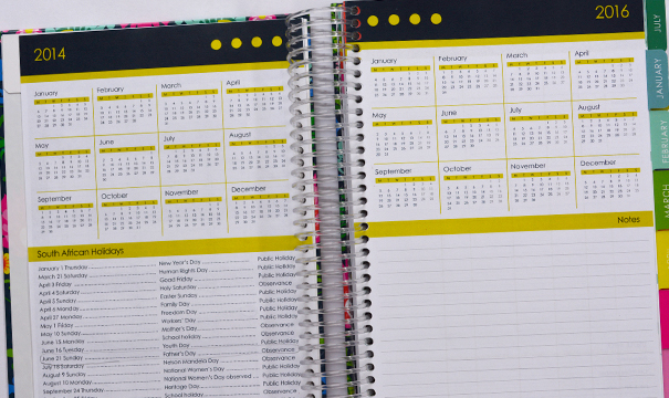 Another double-page spread features both 2014 and 2016 at a glance - allowing you to look both backwards and forwards when needed, as well as a detailed list of South African public holidays, occasions and observances.