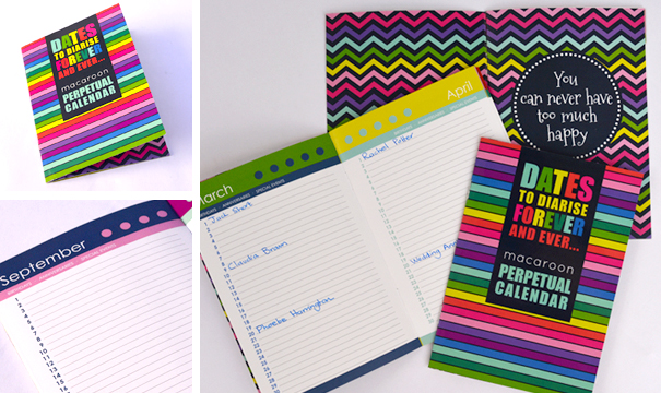 Our 2015 limited edition diaries also come with this FREE nifty A6 sized perpetual calendar - reminding you that "you can never have too much happy!" This bright little book allows you to fill in monthly birthdays, anniversaries and other important annual dates - and to move it from year to year in to your future diaries.